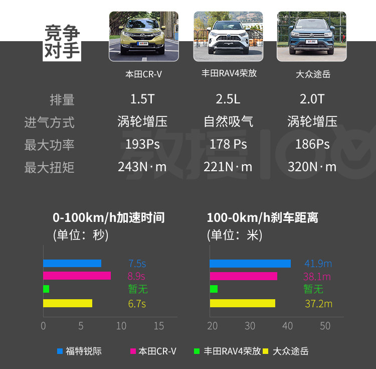 由于采用的轮胎是一套强调舒适的产品,锐际的刹车成绩并不好,如果车主对此不太满意,后期可以换装一些性能胎来满足自己的需求。