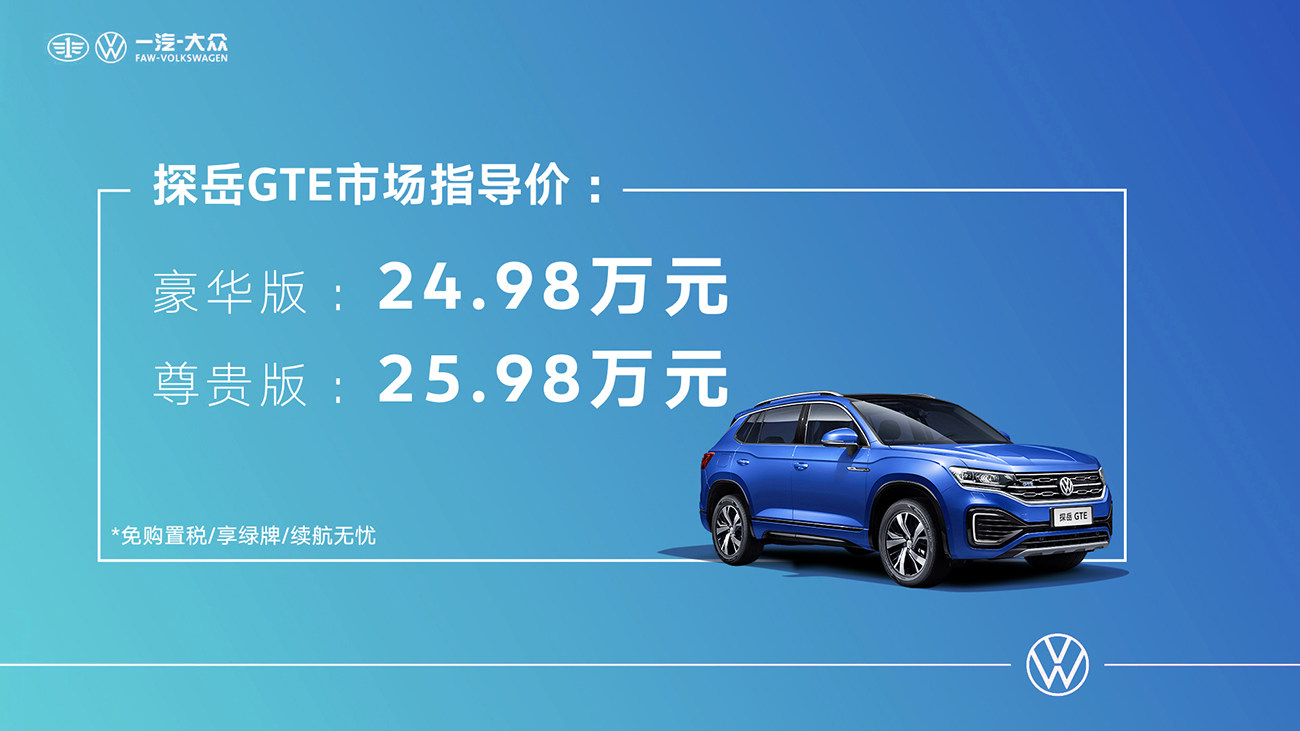 4月25日,一汽-大众GTE技术品牌发布暨探岳GTE硬核试验上市发布会以线上直播的方式举行。发布会上,一汽-大众大众品牌首款SUV新能源车型——探岳GTE澎湃上市,为消费者提供豪华版和尊贵版两款车型,售价分别为24.98万元、25.98万元。探岳GTE拥有大众GT家族的赛车基因和高效插电式混合动力技术,享绿牌、长续航、可充电、可加油、油耗低、动力强,可同时享有纯电车、混动节能车、高性能车的用车优势,可谓一车三得,势必成为合资插混市场的新标杆。