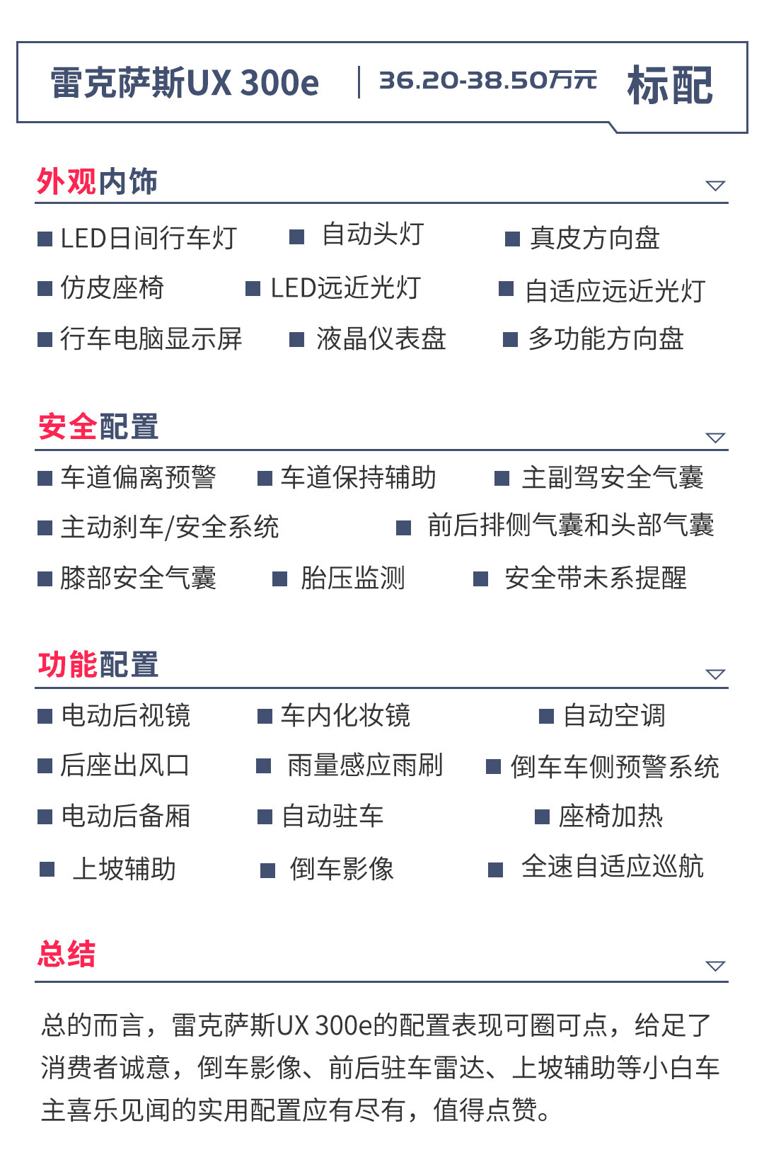 当然,就事实而言,UX 300e这款新能源新秀,除续航、空间、价格差那么些,质感也确实没得挑,假若在价格、续航、空间这三个方面能多加完善一下,对有意购买豪华新能源车的消费者而言,倒也不失为一个购车之选。
