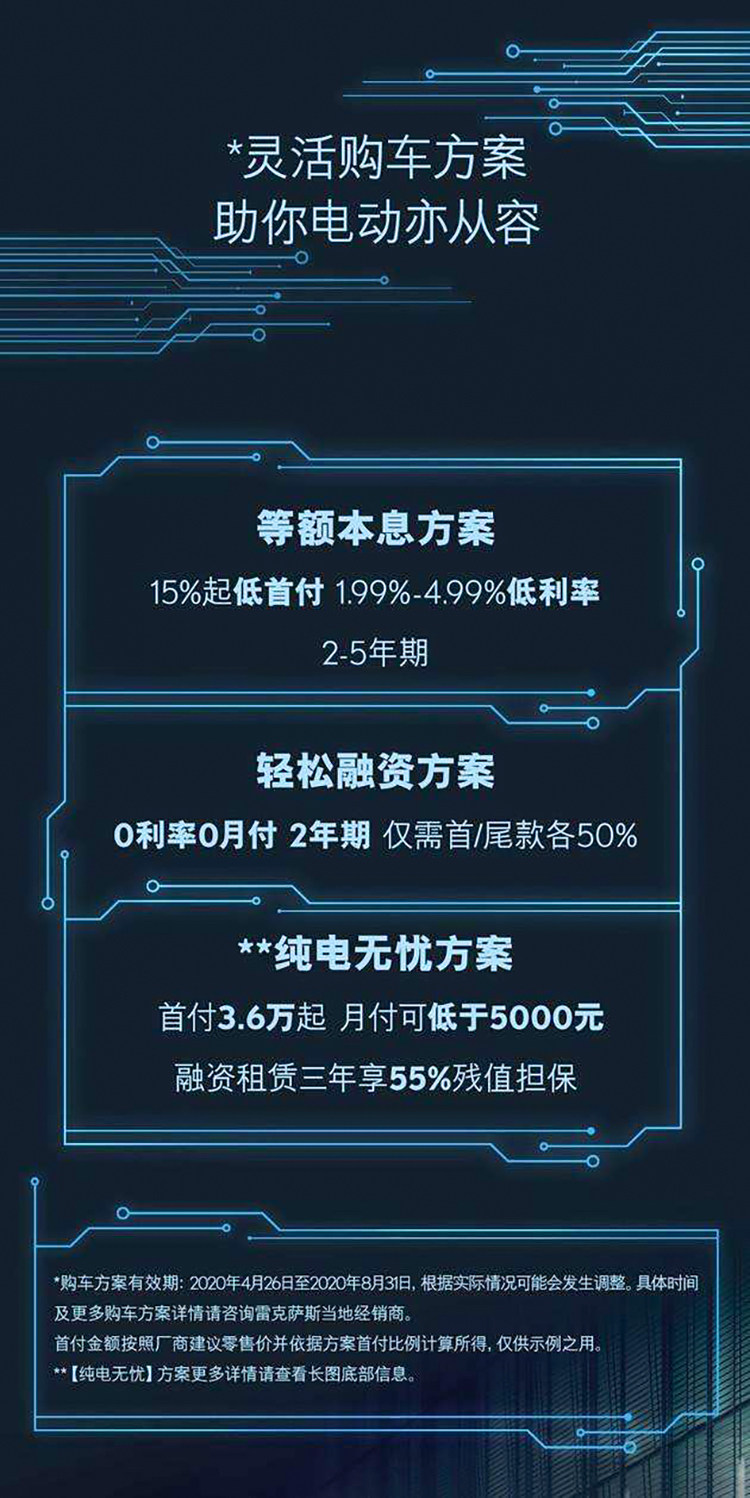 值得一提的是,在车市下行+疫情环伺的条件下,雷克萨斯UX 300e推出了三种购车金融福利,以此达到刺激消费者,挑起消费者对自家产品的购买欲望。根据雷克萨斯官方信息显示,在2020年4月26日到8月31日,用户可根据自己的情况,自由选择等额本息、轻松融资、**纯电无忧三种购车方案里面的其中一种。