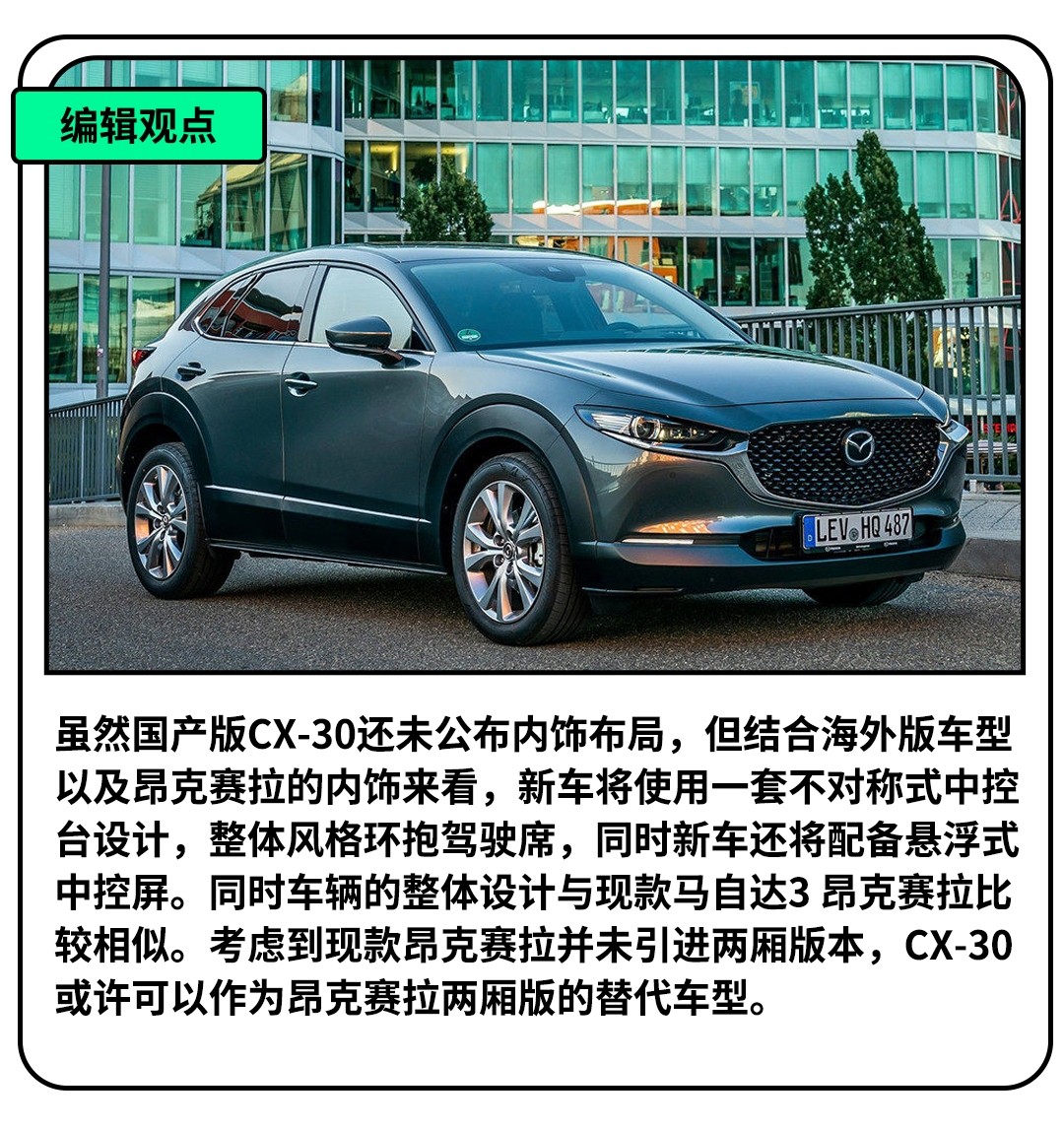 近期长安马自达全新车型——马自达CX-30正式下线,并且车辆已于4月26日晚公布了预售价,预售价区间为xx.xx-xx.xx万,上市日期定为今年5月28日。车型在设计上基本与海外版保持一致,并且将搭载最大功率158Ps的2.0L发动机,不过海外版有提供2.5L版本,不止国内市场是否会打算后续引进。