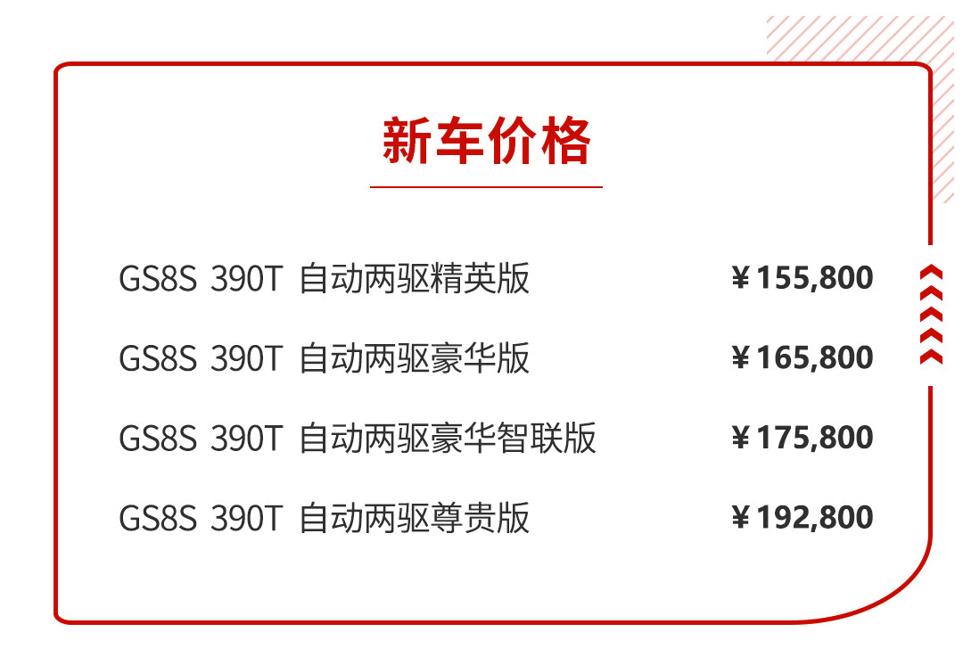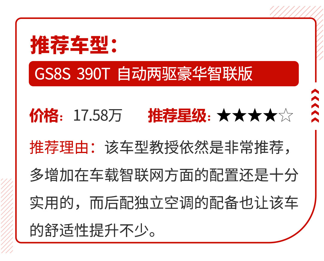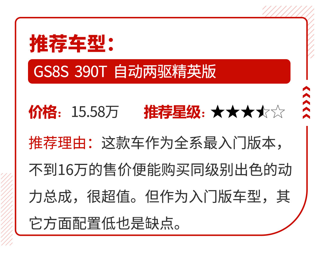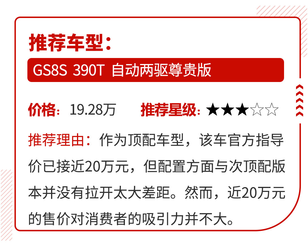 全新广汽传祺GS8S共推出4个版本车型,均搭载2.0T+6AT的动力总成,无论是动力规格还是参数层面来说,GS8S面对同级别对手还是十分占优的。配置方面,下面教授就和大家来作出推荐。
