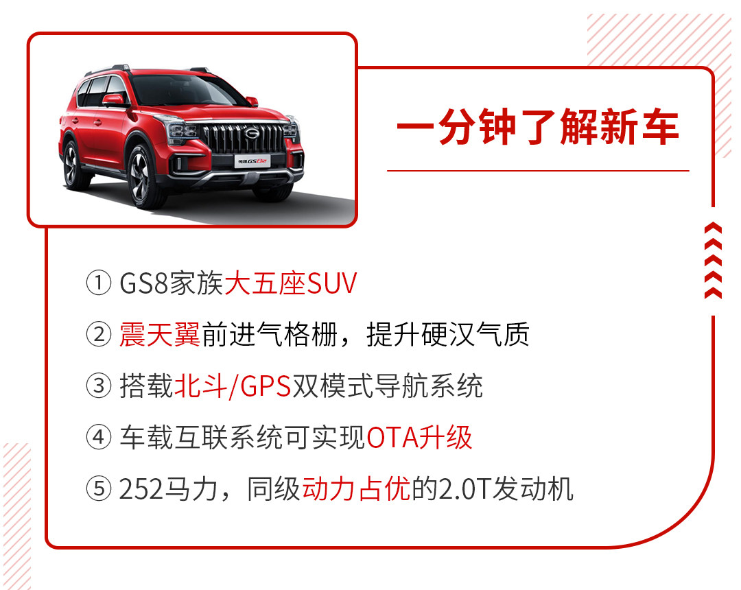 此次上市的传祺GS8S是GS8家族的第二款SUV产品,不仅传承了GS8备受赞誉的优秀设计,同时还融入了更多时尚、个性的元素。传祺推出5座布局的GS8S,其目的是希望延续GS8优秀的市场口碑,并加入到大5座SUV这一竞争激烈的细分市场,以满足更多消费者的需求。