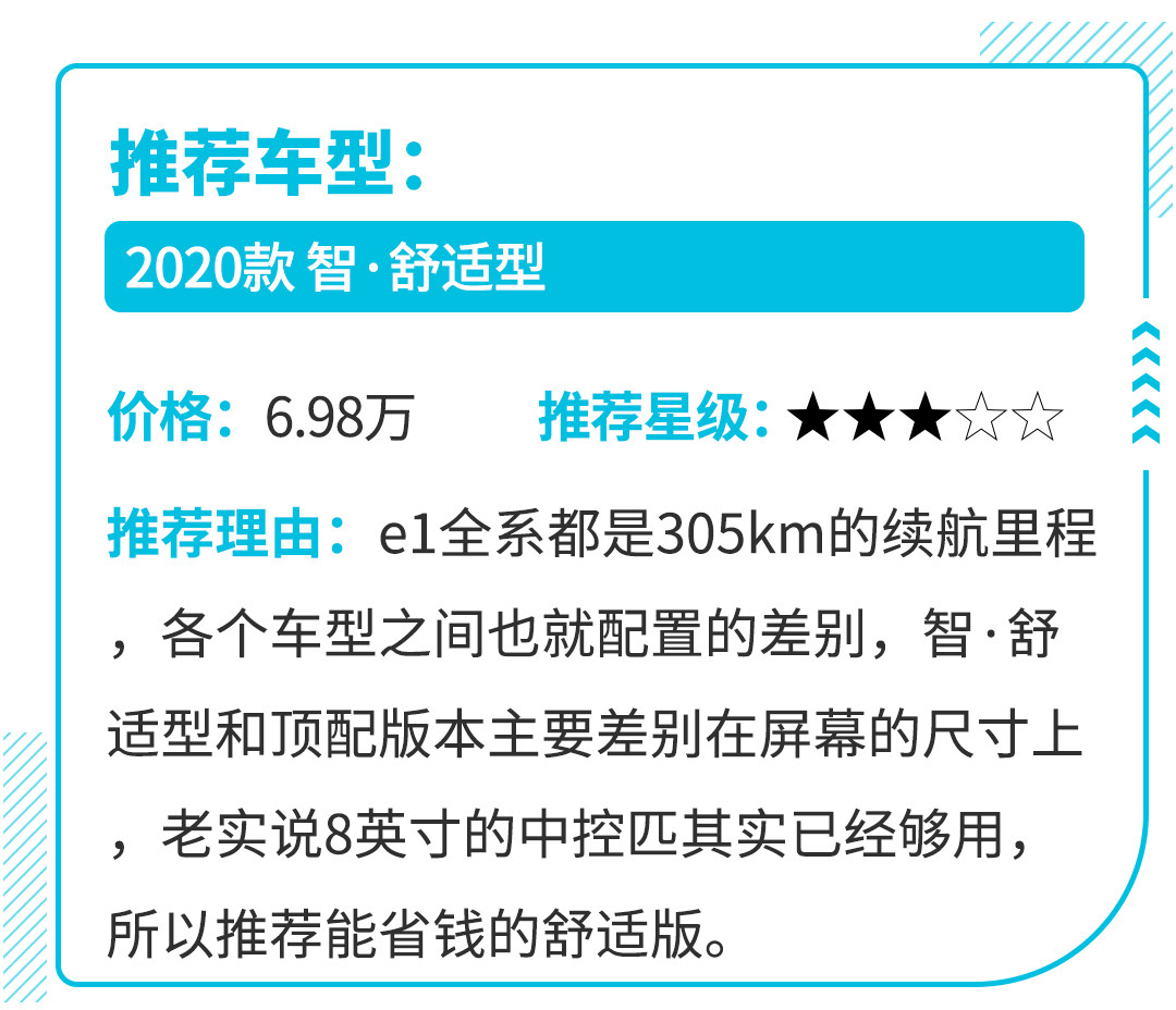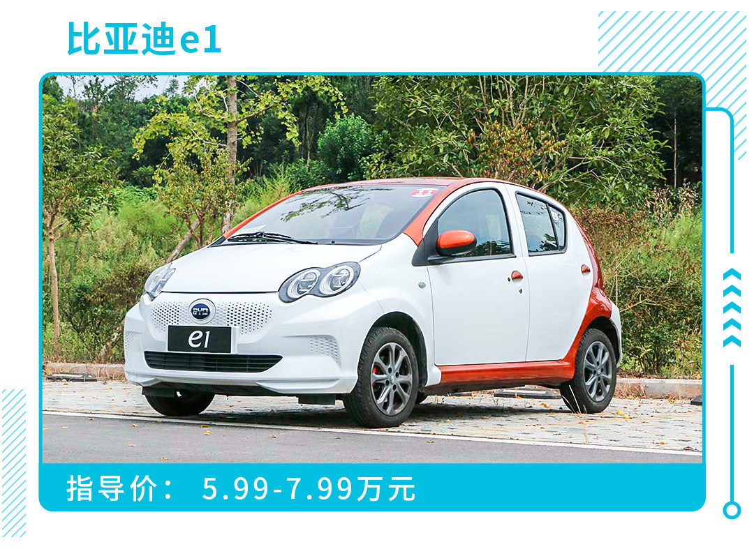 这款车的指导价为5.99-7.99万元,虽然比前两车高,但品质也要好一些。比亚迪e1选用一台交流永磁同步电机,系统最大马力61Ps、峰值扭矩110N·m。其使用容量为32.2kWh的三元锂动力电池组,车辆NEDC综合续航里程达到305km。