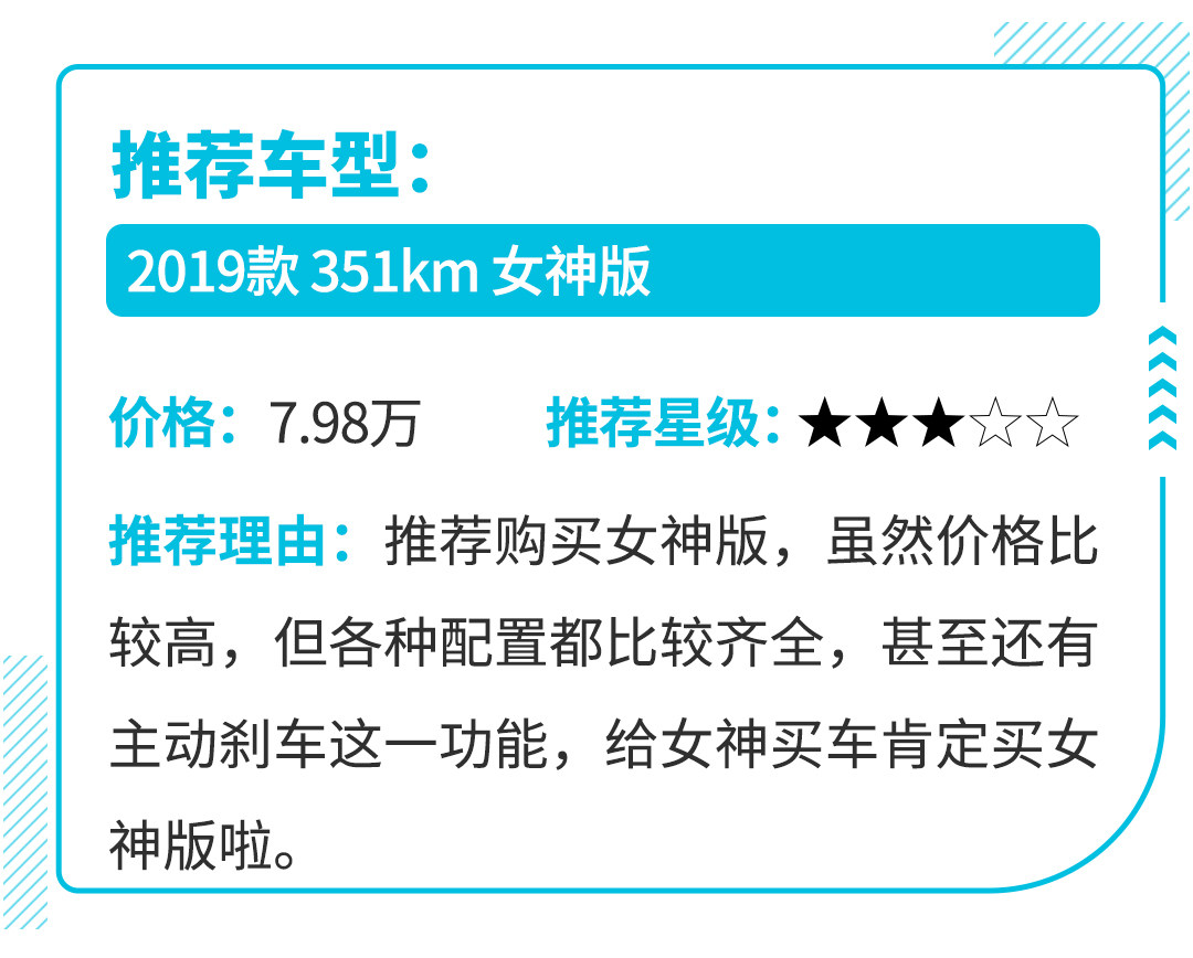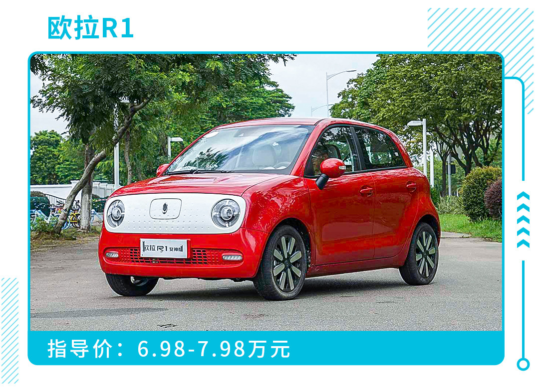 同样的价格可以选择欧拉R1,指导价为6.98-7.98万,共四款车型可选择。这款车的外观萌萌哒,甚至比起smart forfour也是丝毫不虚。而且它的内饰也并不显得简洁廉价,中控的设计、座椅所采用的的色彩搭配,都能俘获俊男美女的心。