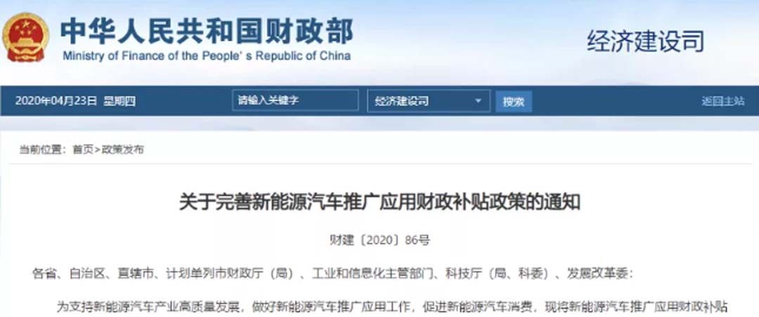 继正式下发关于新能源汽车免征车辆购置税延长两年政策后,4月23日四部委(财政部、工信部、科技部、发改委)再发布《关于完善新能源汽车推广应用财政补贴政策的通知》,就是大家熟悉的2020新能源补贴政策。