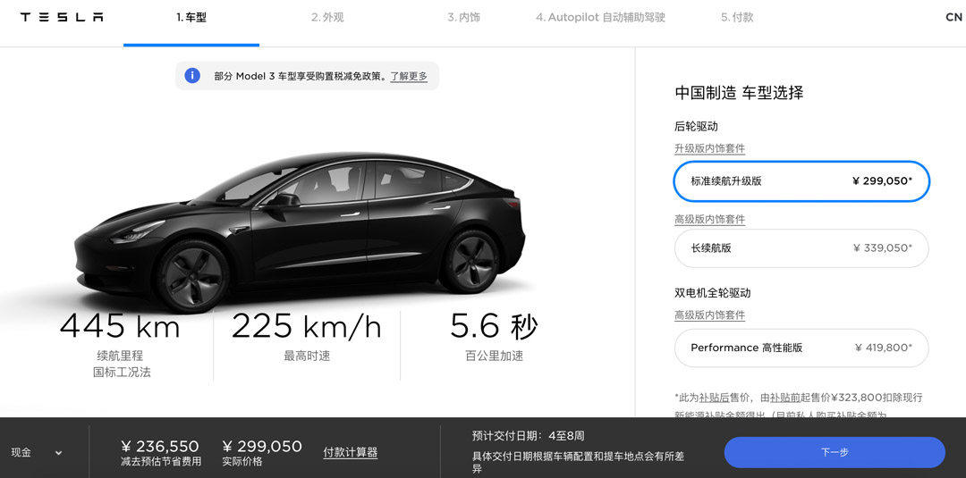 国产Model 3标准续航升级版补贴前售价为32.38万元,根据2019年的补贴标准,补贴后售价为29.90万元,政府补贴约2.5万元。而根据新政策,售价超过30万的国产Model 3将不再享受相关补贴。