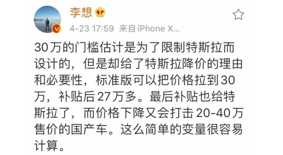 李想认为“30万门槛估计是为了限制特斯拉而设计的,但却给了特斯拉降价的理由和必要性”,他还认为Model 3标准版可以把价格拉到30万,补贴后27万多,最后补贴也给了特斯拉,而价格下降又会打机20-40万售价的国产车。