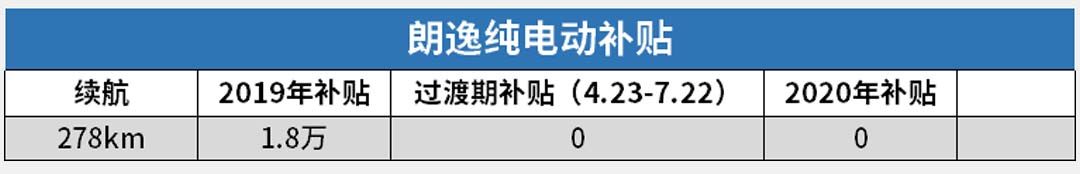 以续航里程为278km的朗逸纯电动为例,其满足2019年的补贴标准,而不满足2020年补贴标准,所以在过渡期内能够享受2019年政策对应标准的0.5倍补贴,即9000元,而过了7月22日,则不再享受补贴。