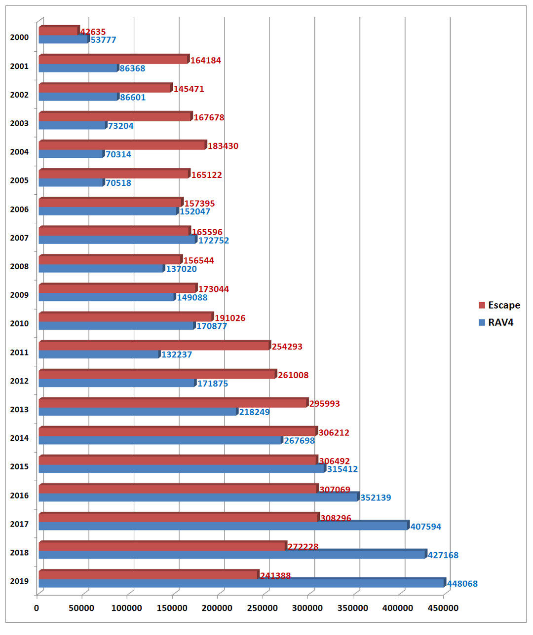 然后1994年开始量产第一代RAV4,其实刚刚推出的时候并没有收获很很的市场表现,当时体量最大的美国市场年销量才几万辆,然后福特也推出了它的城市SUV——Escape,它尺寸更大、更舒适,一发布就爆红;然后RAV4经过调整方向调整产品力,做得更舒适更居家也加大了尺寸,加上丰田可靠耐用的品质,现在已经成为全球销量最高的SUV车型。