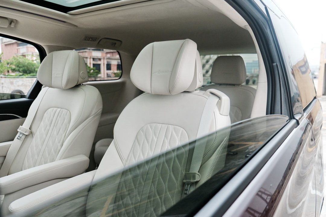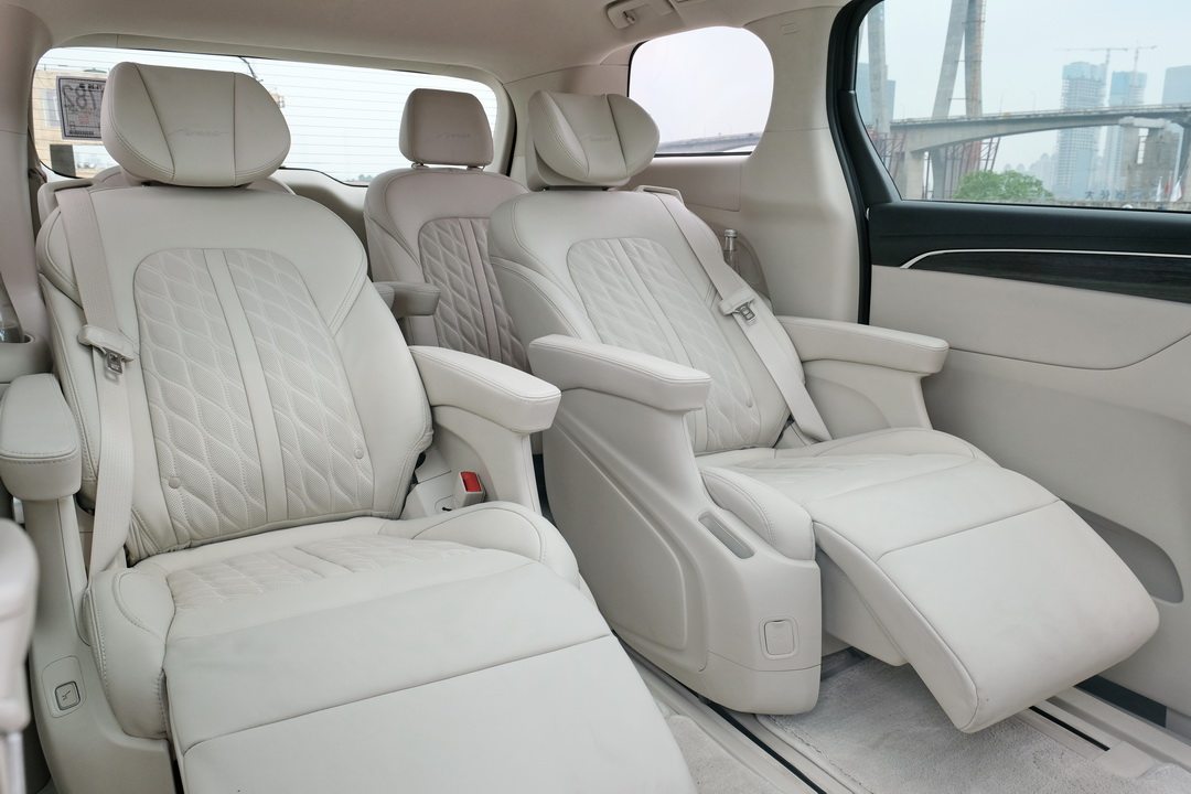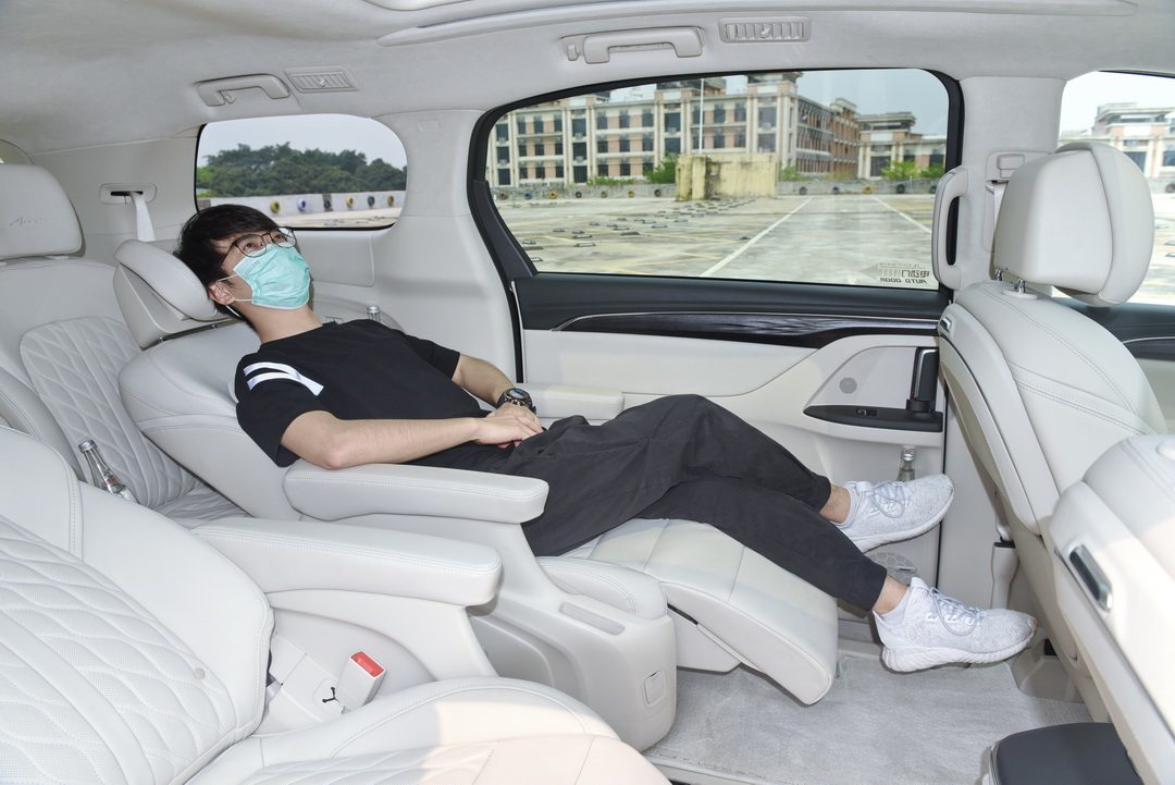 四座版的二排座椅相比六座版往后平移350mm,形成一个前所未有的宽绰空间,仿佛坐在移动宫殿之上。由于无需考虑第三排通过性,于是增加了座椅和扶手的宽度,坐姿更加从容自在,其极致的空间感纵观国内的汽车市场,似乎也仅有同样采用四座布局的雷克萨斯LM才能实现。