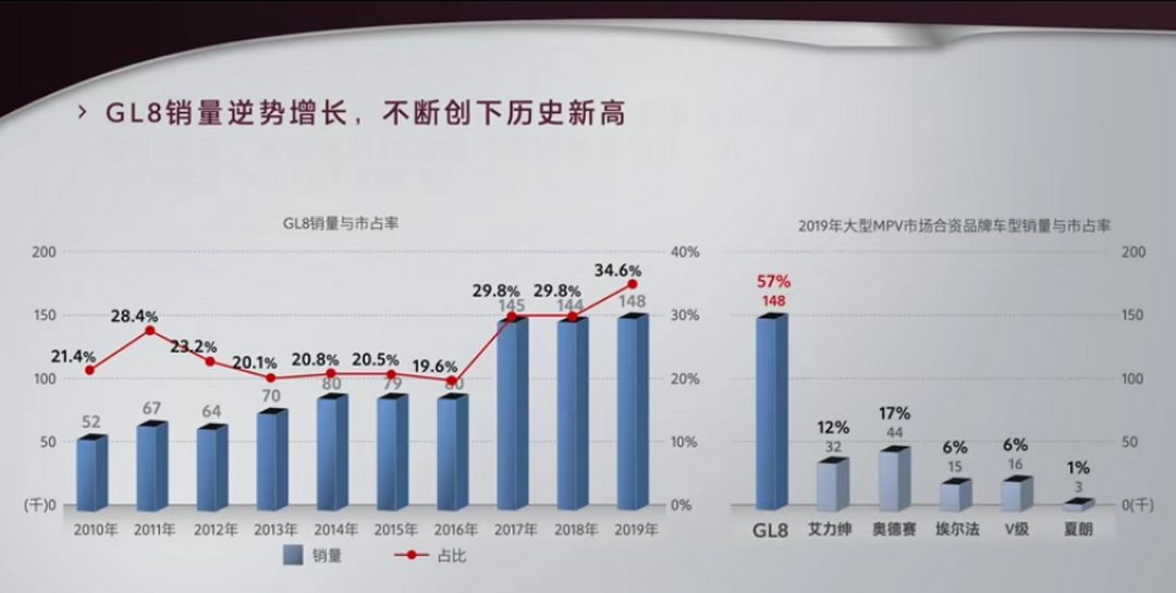 再有就是别克GL8的品牌价值,别克GL8深耕中国市场20余年,截止至2019年,GL8的累计销量突破122万辆,在合资MPV市场中占有率达到57%,这意味着每卖出两台合资MPV,必定有一台是别克GL8。