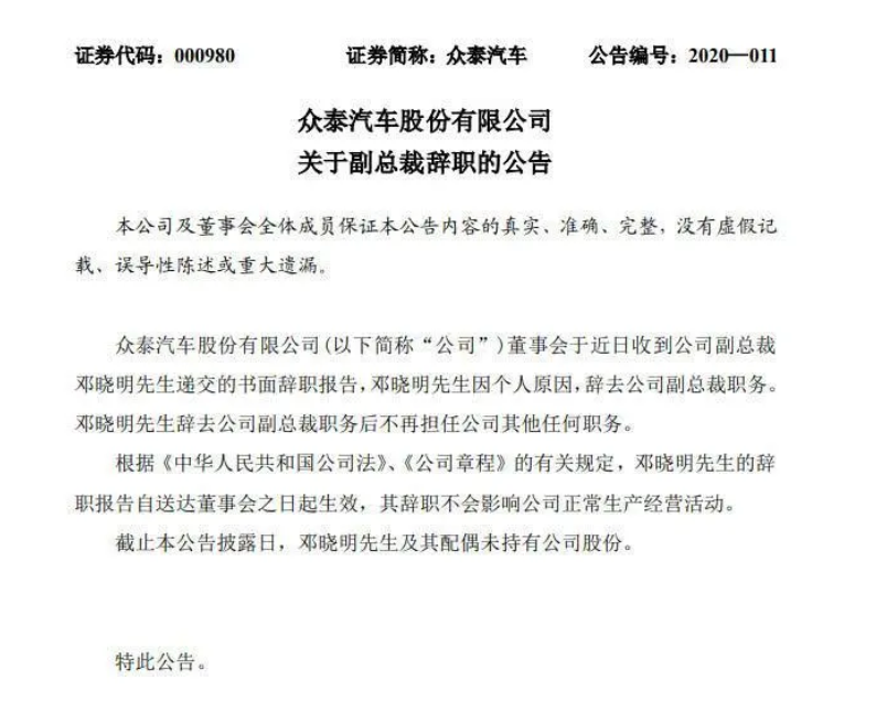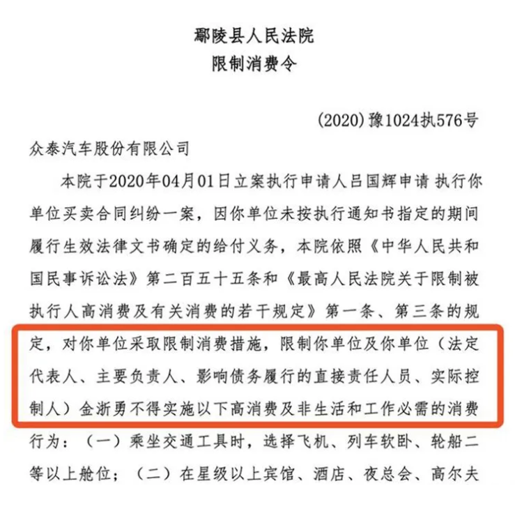 4月4日,众泰汽车董事长金浙勇因买卖合同纠纷,被限制高消费,该案的执行标的仅9.08万元。简单来讲就是众泰集团内部的可用资金,连一笔9万元的欠款都应付不来。与此同时,还有多位高管出走的新闻。2019年11月,公司副总裁杨建辞去职务;2020年3月8日,公司副总裁陈静辞去职务众泰大迈总经理;2020年3月17日,众泰汽车副总裁邓晓明辞去公司副总裁职务。