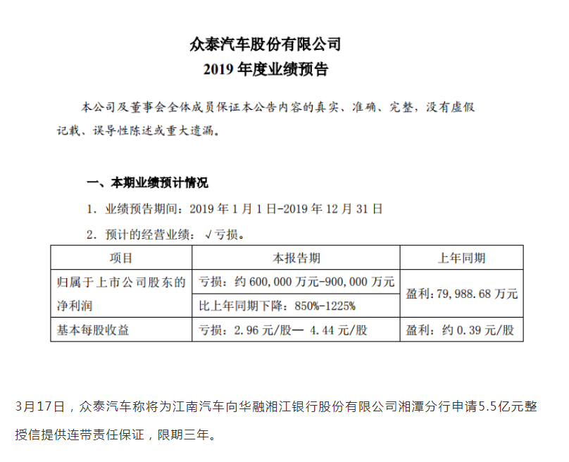 根据今年一月份众泰汽车对外披露的《2019年业绩预告》显示,预计2019年归属于上市公司股东的净利润亏损约60-90亿,较上年同期下滑850%-1225%(2018年盈利约8亿)。