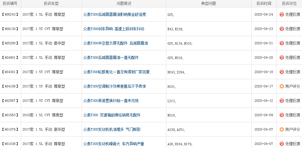 而T300作为目前众泰的支柱车型,据统计T300去年的累计销量占众泰份额超过45%。然而热销背后却是频发的质量问题,根据车质网的统计显示,三大件几乎全军覆没,车身附件及电器也是“高发病”区域。
