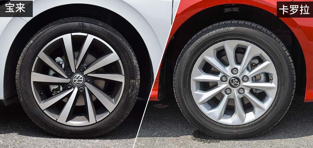 轮胎方面,两车低配车型均采用15英寸铝合金轮毂,中高配车型上,宝来为16英寸,而卡罗拉则有16和17两种尺寸,选择更多。在中高配车型中,宝来轮毂的造型富有运动感,卡罗拉则相对比较普通,一副普通家用车的作风。