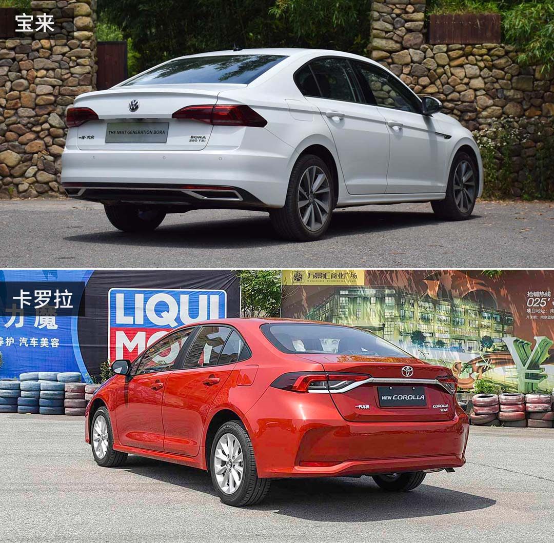 车尾造型均比较沉稳,层次分明。两车均使用了隐藏式排气管设计,不过卡罗拉或许是考虑到混动车型所以看上去更干净,而宝来则用镀铬饰条划出了两条假的排气口,增添了一定的运动气息。