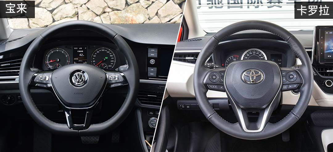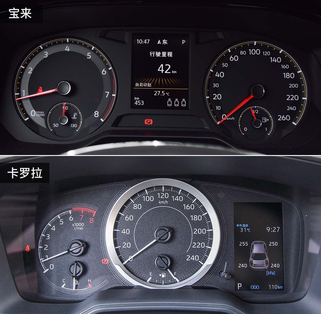 仪表盘均采用了传统的机械式指针加液晶显示屏的搭配,其中宝来的采用了大众经典的设计,双实体仪表盘中间夹一块彩色显示屏;而卡罗拉的两块实体仪表盘则在显示器一侧,科技感略显不足。