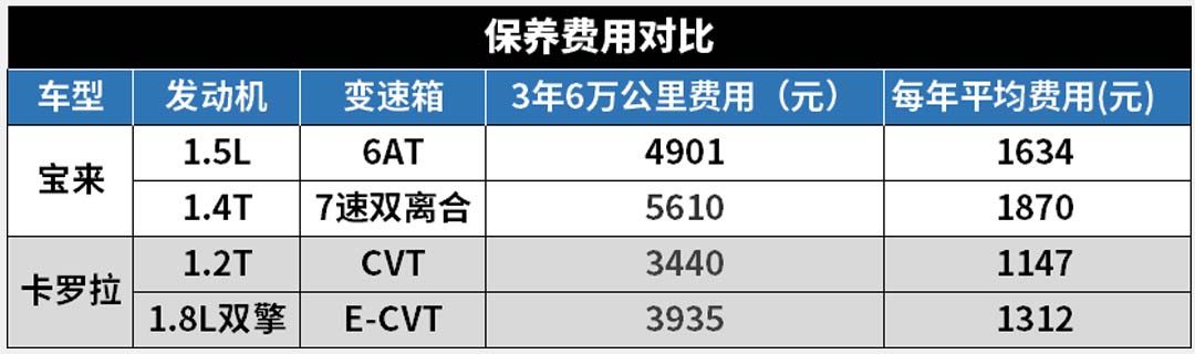 在后期保养中,宝来1.4T车型因为需要添加全合成机油,所有每次的保养费用相对高一些,按3年6万公里计算,总费用约为5610元,每年平均1870元。而卡罗拉则相对要低一些,1.2T车型每年平均1147元,混动车型每年平均1312元。但整体来看,差别不是很大。