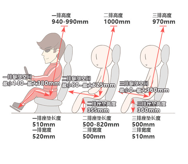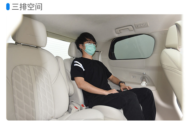 第三排座椅舒适性也相当高,第二排座椅稍微调节一下,只要身材不是特别魁梧,正常常年人乘坐都没有问题,头部空间,座椅包裹性都相当到位,坐垫高度有36厘米,是相当合理的高度。