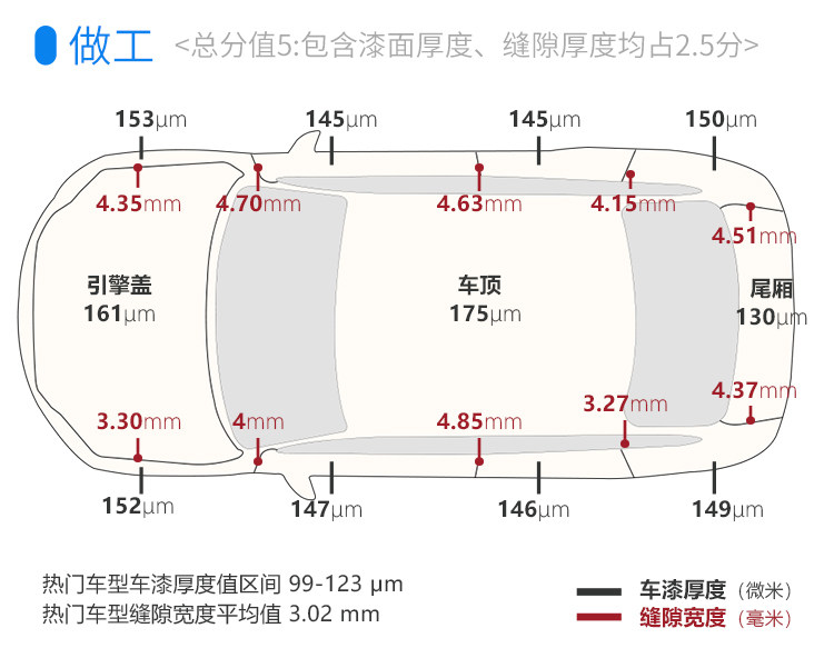 可以看到Avenir的车漆都相当考究,基本是维持在145μm这个区间,误差很小,色泽也相当棒;另外板件间隙而在4mm出头,相对来说较大,可能是MPV的缘故,所以跟轿车SUV是有区别的,此前测试过的威尔法板件间隙也不小。