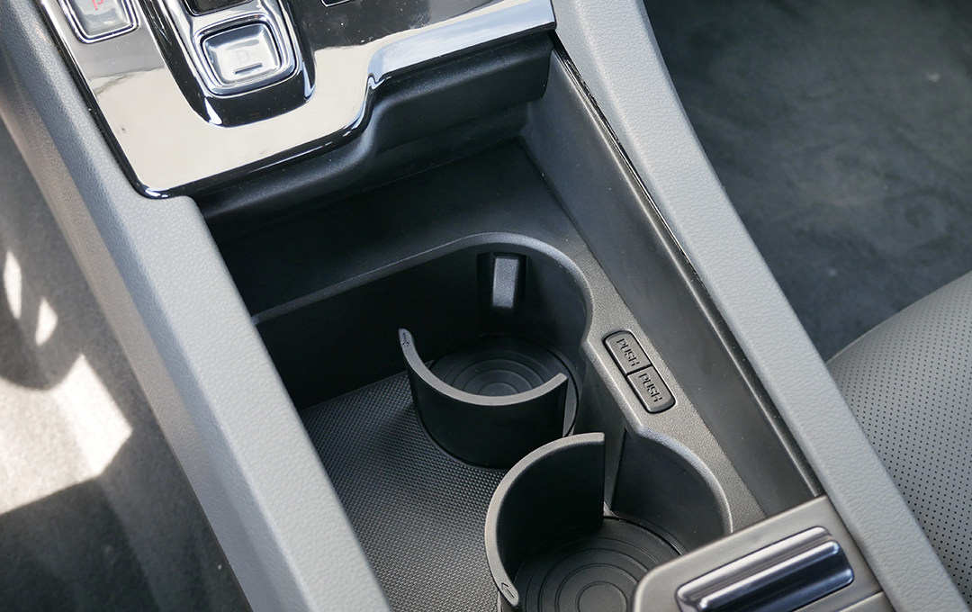 由于采用了电子换挡方式,在换挡区域中节约了更多的储物空间。储物盒中有一个设计细节,杯架可以自行取舍,无论是零散物品,还是日常的水瓶,都能很好的进行容纳。值得一提的是,高亮界面虽然观感好,但是在日常使用中容易成为指纹收集器。