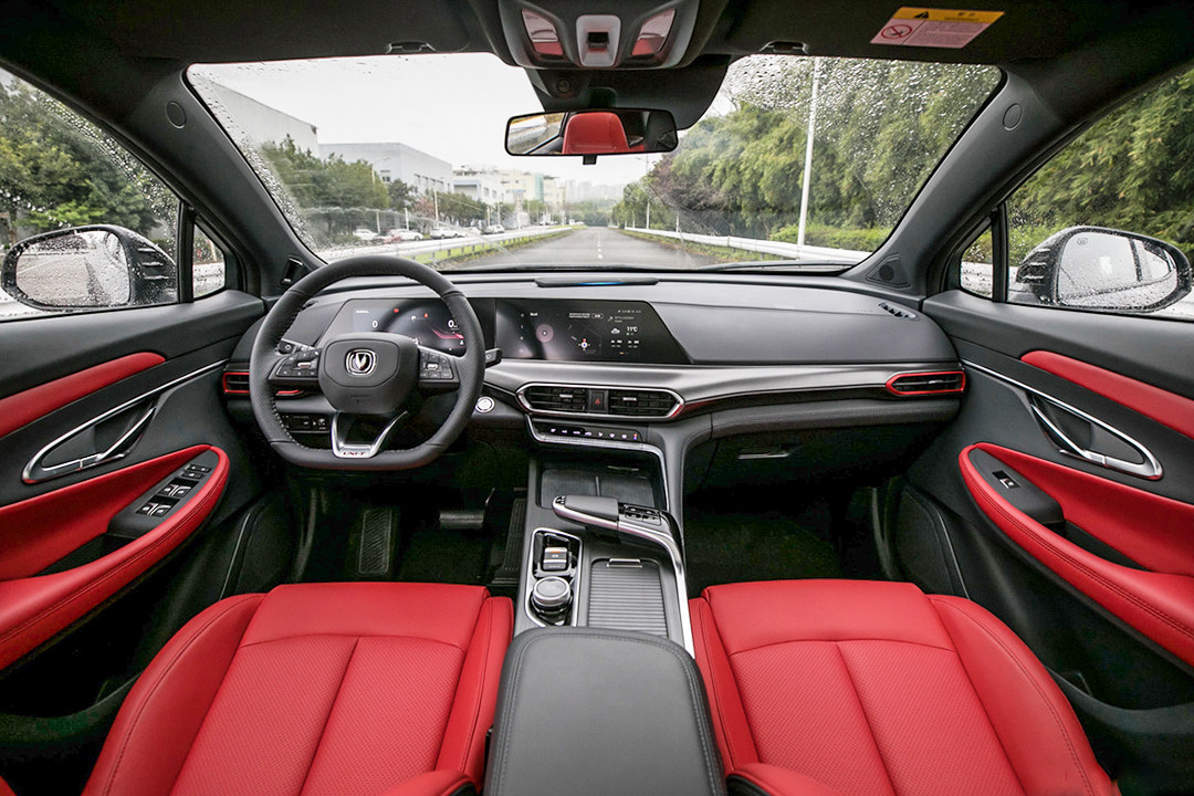 如果说UNI-T运动版的外观是深沉、克制,那么内饰则可以用奔放、豪迈来形容,那股在外观好不容易被压抑住的闷骚劲,在舱内表露无遗。飞行操纵杆式换挡机构、骚红色运动座椅以及撩动驾驶欲望的平底方向盘便是最佳佐证。