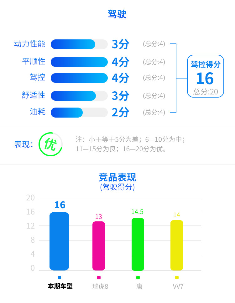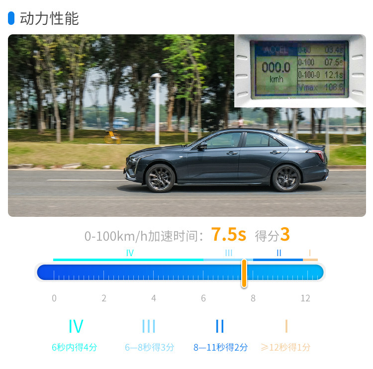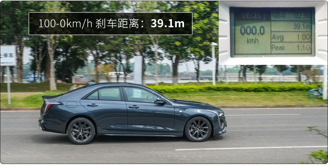 由于当天的气温较高,所以跟官方的成绩有一定的差距;油门刹车踩死可以原地烧胎,整个提速过程有充足的动力储备,起步姿态较稳,加速过程基本没有打滑;竞品当中加速性能是比较令人满意的表现,而制动表现基本持平,差别不大。