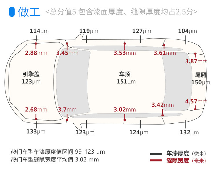 做工表现中规中矩,前后方的板件间隙并不统一,而且差值较大,但左右比较对称;漆面厚度在125μm上下浮动,误差同样较大。