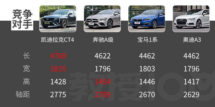 CT4的官方定位是中型轿车,实际上它价格对标的竞品是BBA的紧凑型轿车,在车身尺寸上CT4有一定的优势。