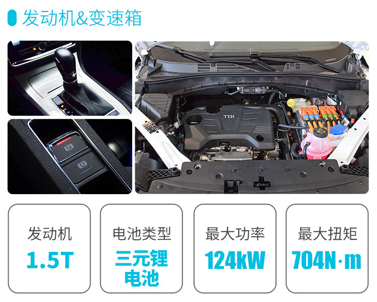荣威RX5新能源基于上汽SSA+平台打造的,.5TGI缸内中置直喷涡轮增压引擎+永磁同步电机,系统综合功率124kW,峰值扭矩高达704N·m,零百加速7.8s。在动力电池的加持和EDU 2挡电动变速箱的辅助下,综合油耗低至1.6L,最高续航里程达650km,其中纯电续航里程为60km。