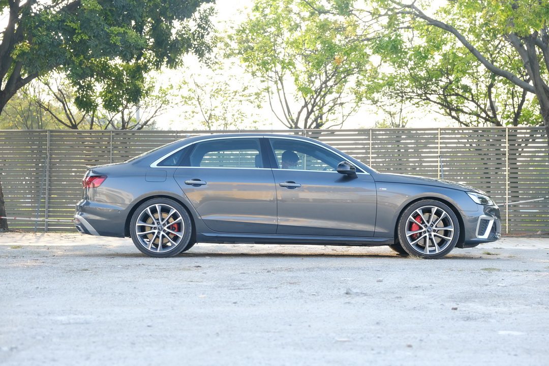 由于奥迪A4L只是中期改款,其轴距并没有改动,所以奥迪A4L的侧面线条跟旧款基本保持不变。扁平比为35的19英寸轮胎搭配红色卡钳,其运动的视觉效果营造得十分到位。