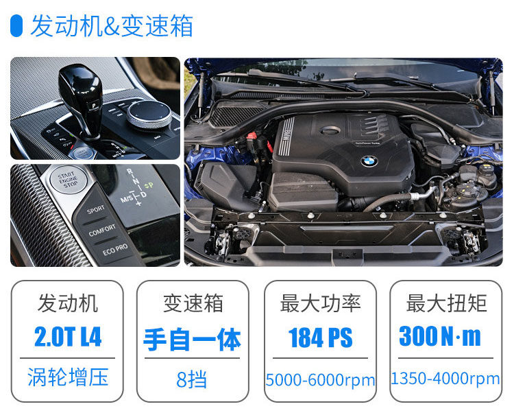 而宝马3系 325Li M运动曜夜版采用的是中功率2.0T,最大马力是184匹马力,搭配的是8AT自动变速箱。宝马3系也是全系2.0T版本,低功率版本的最大马力是156匹,高功率版本的是258匹马力。