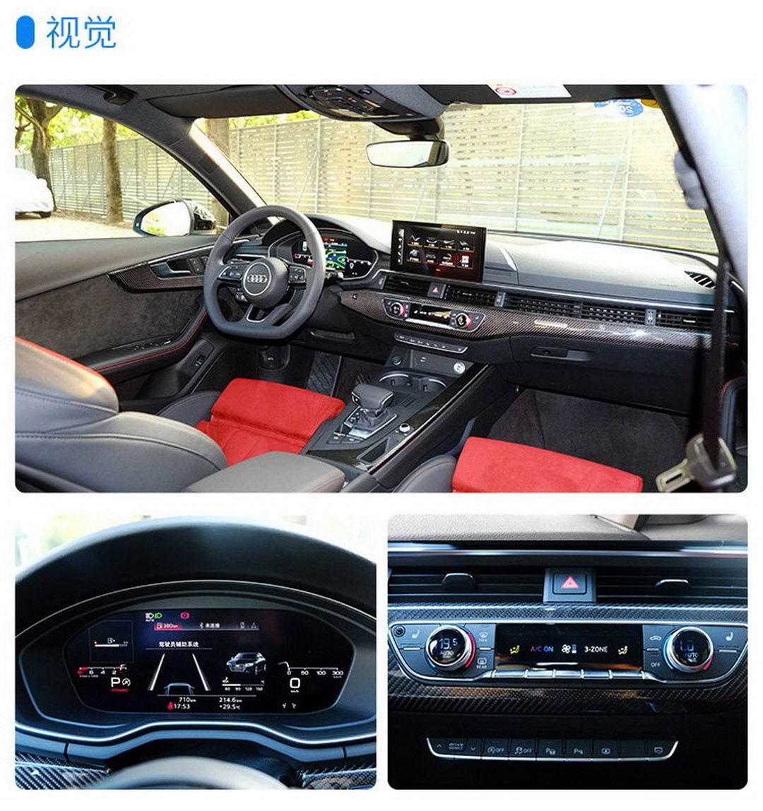 奥迪A4L的内饰设计延续了改款前的设计语言,贯穿式的空调和液晶空调面板看上去科幻感十足。由于这是一台运动版,所以车内多了很多翻毛皮和碳纤维的材料。奥迪A4L取消了MMI的拨轮,所以挡把前多了一个储物格。