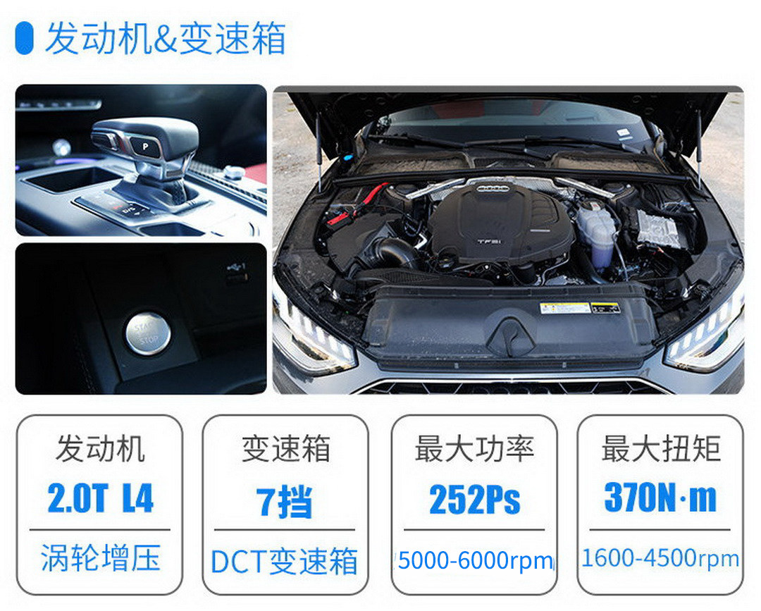 奥迪A4L 45TFSI quattro 臻选动感型采用的是高功率2.0T,最大马力有252匹,搭配的是7速双离合变速箱。奥迪A4L中期改款后全系采用2.0T,低功率版本只有150匹马力,跟1.4T的马力一样,中功率依然是190匹马力。