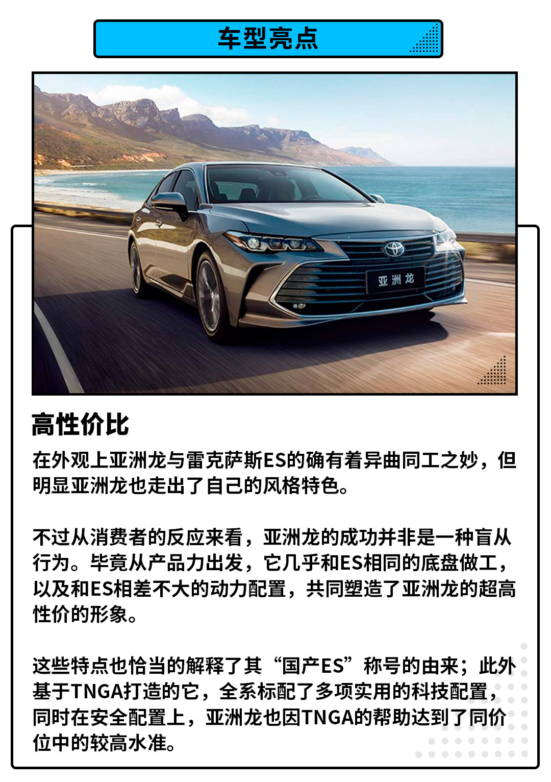 而亚洲龙大获成功的原因正是其杀伤力很强的性价比,一辆身长逼近5米,轴距2.87米的B级家轿;在起售价不足20万的情况下,标配了LED大灯、主动安全系统、8安全气囊等实用配置,自然让其本身就拥有很高的热度。