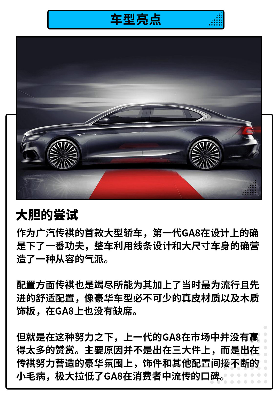 造成上述情况的原因,一部分也是由于传祺在轿车领域的不擅长所导致;这种失利也让传祺变得谨慎了许多,目前仍然在售的GA8已经3年没有更新车型,而传祺也是利用这三年的收获和经验,打造出了新一代GA8,并于去年的广州车展亮相。