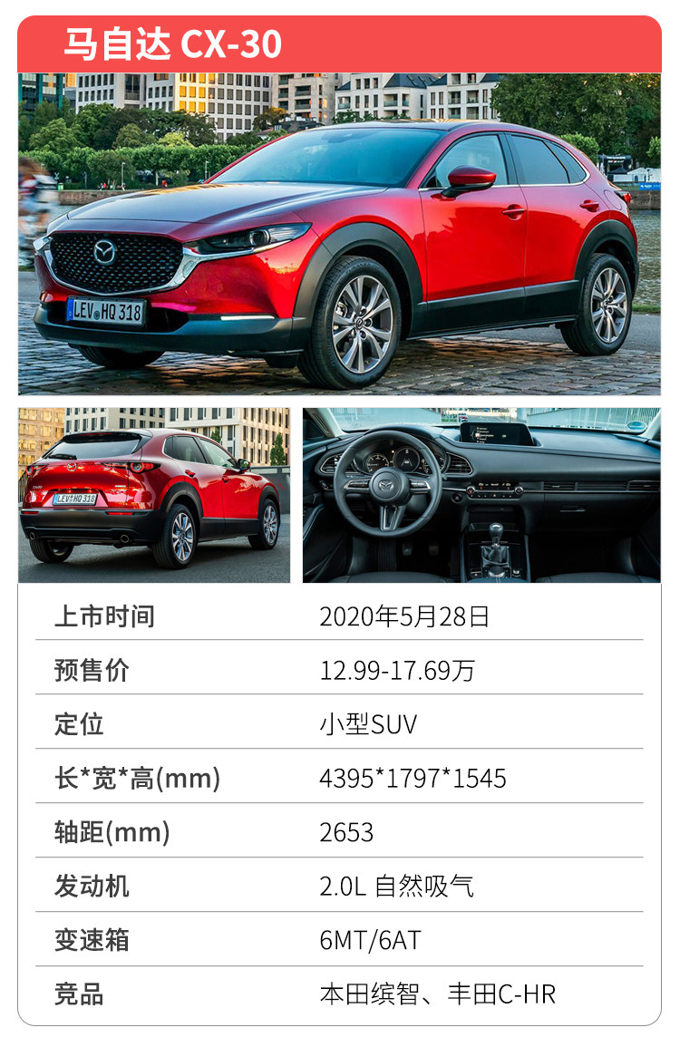 CX-30定位在CX-3以及CX-5之间,属于小型SUV,与本田XR-V、丰田C-HR以及大众探影等对手相竞争,预售价12.99-17.69万。新车属于马自达第二款次时代车型,采用与马自达3昂克赛拉相同的平台,以及相同的设计语言。