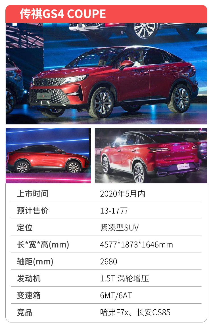 在2019年底,传祺GS4 COUPE就正式发布,只是由于春节假期以及疫情关系,上市节奏一再延后,在这个5月它终于能上市销售。新车是传祺品牌首款轿跑式SUV,基于传祺GS4基础上打造,但采用全新、更具进攻性的前脸设计,侧面可以看到双色车顶以及明显的溜背元素,视觉上更像是一辆加高加大的轿车。