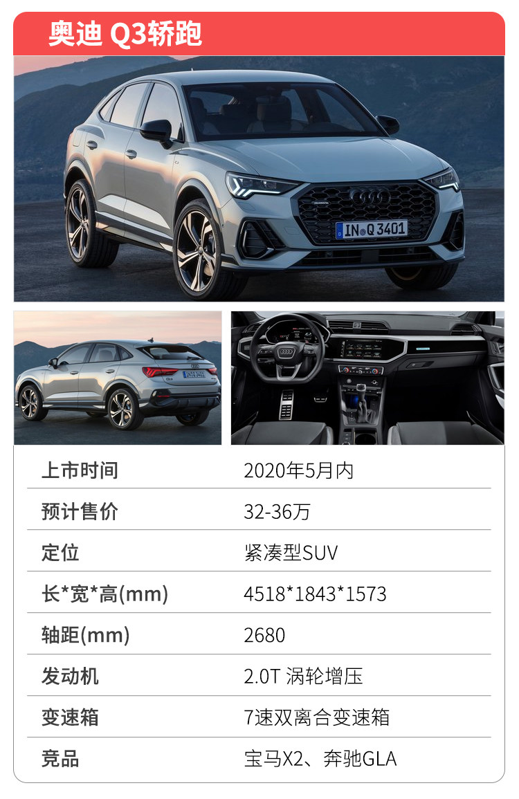 新车定位轿跑式SUV,基本延续了海外版的设计,前脸基本与如今的Q3相同,其最大特点在于采用溜背式设计,B柱以后有着明显的下滑,侧面来看尾部更显敦厚。新车未来也将提供高亮选装包,包括了“黑化”的前进气格栅、车顶行李架、后视镜以及前后包围等,明显想要俘获更多年轻消费者欢心。