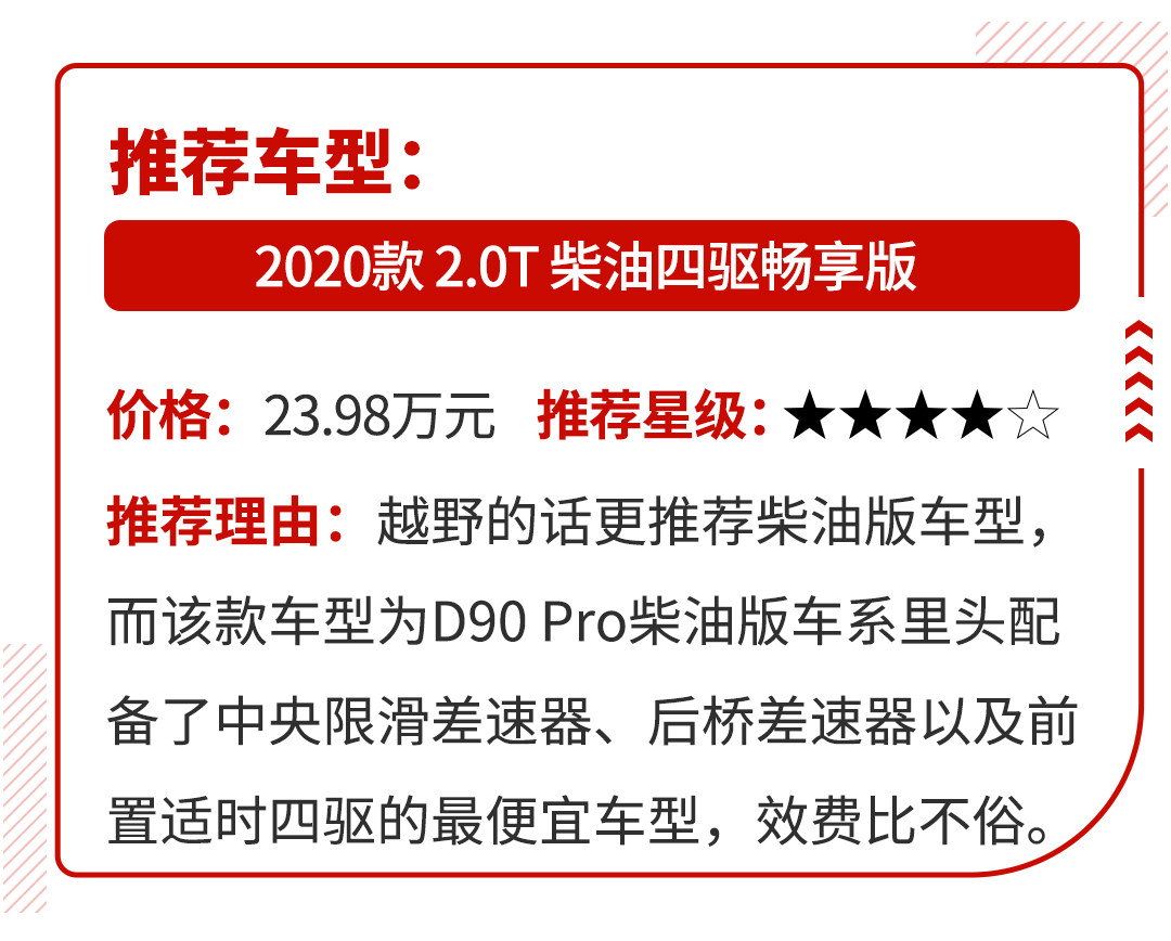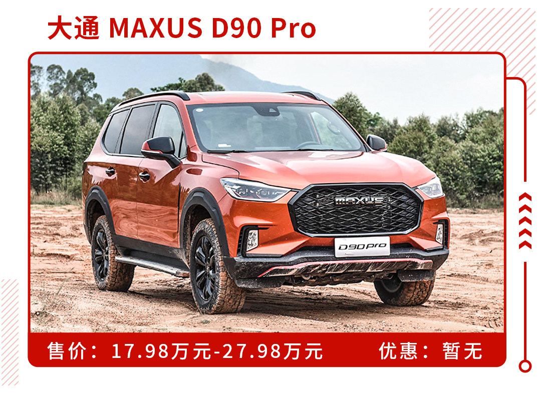MAXUS D90 Pro定位“两栖”中大型SUV,精致外观和温馨内饰让它足以胜任都市SUV,而魁梧尺寸与过硬越野性能让它轻松游走在野外,动力方案供汽油版和柴油版可选,且均符合国VI b排放标准,辅以大通引以为傲的高度个性化选装服务,D90 Pro的受众面相当的广。
