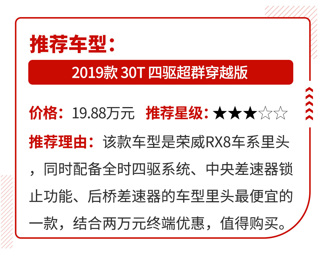 除了后驱车型外,荣威RX8还供多片离合器式全时四驱车型可选,且配备代表着越野车尊严的中央、后桥差速锁,辅以非承载式车身设计,脱困能力毋庸置疑。