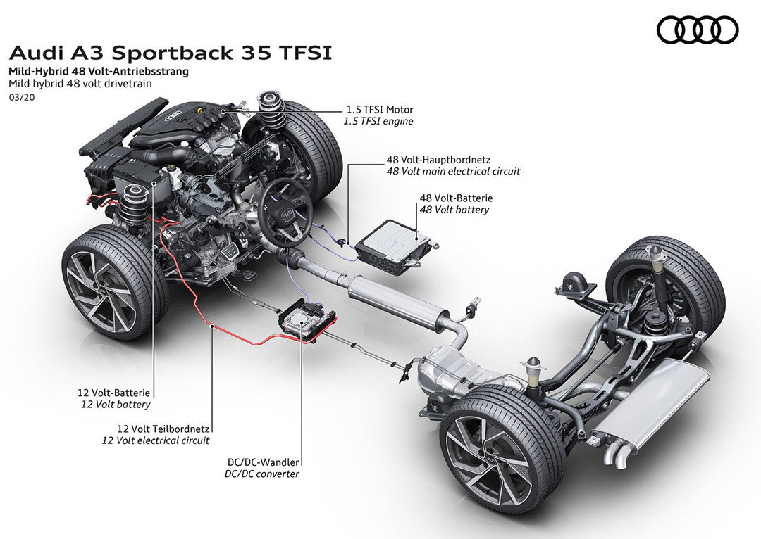 当然,在全新一代A3推出的这些动力系统上,除了1.5T这款发动机有看点,1.5T+48V轻混系统和1.0T引擎也极为引人注目。前者是奔驰奥迪抢着用的混动系统,后者是BBA车型上极为少见1.0T三缸发动机,全新一代A3推它们的意义到底在哪呢?