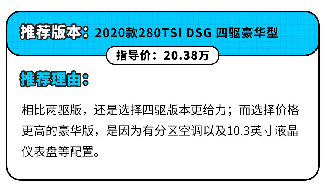 之所以选择四驱豪华版,是因为大众EA211已经是一款非常成熟的发动机,而且以一款紧凑型SUV而言,高功率的1.4T动力可以在一定程度上提升操控。而最关键的是,按照现在的优惠,四驱豪华版也不过17.88万,就问你香不香?