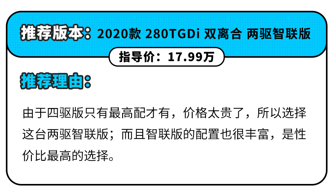 买买君推荐车型为两驱智联版,主要是两驱智联版增加了许多实用的配置诸如:增加了10.25英寸中控多媒体显示屏、全景影像、副驾驶座椅电动调节、前排座椅加热功能盲区监测系统、电动尾门等实用功能。而且偏家用的属性也没有必要强上贵而无用的四驱。
