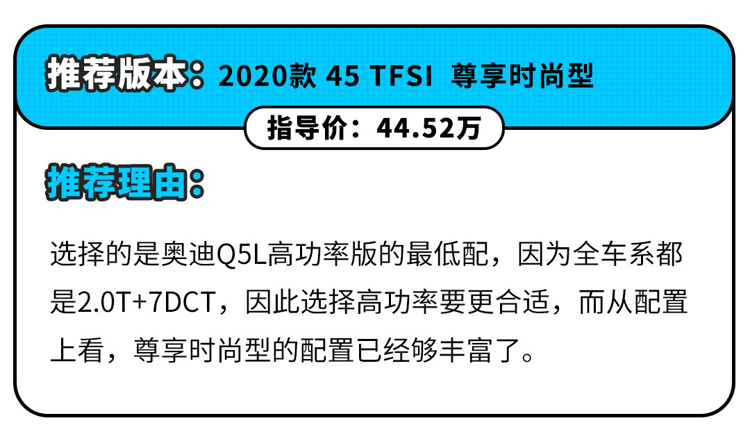 在动力系统上,奥迪Q5L全系搭配2.0T+7挡湿式双离合变速箱,无论在加速性能还是换挡平顺性上都是同级最强的。奥迪Q5L的动力分为高低功率两种,高功版最大马力达到252Ps,峰值扭矩为370N·m,再加上全系标配的祖传quattro适时四驱系统,让你体会到更纯粹的驾驶感受。