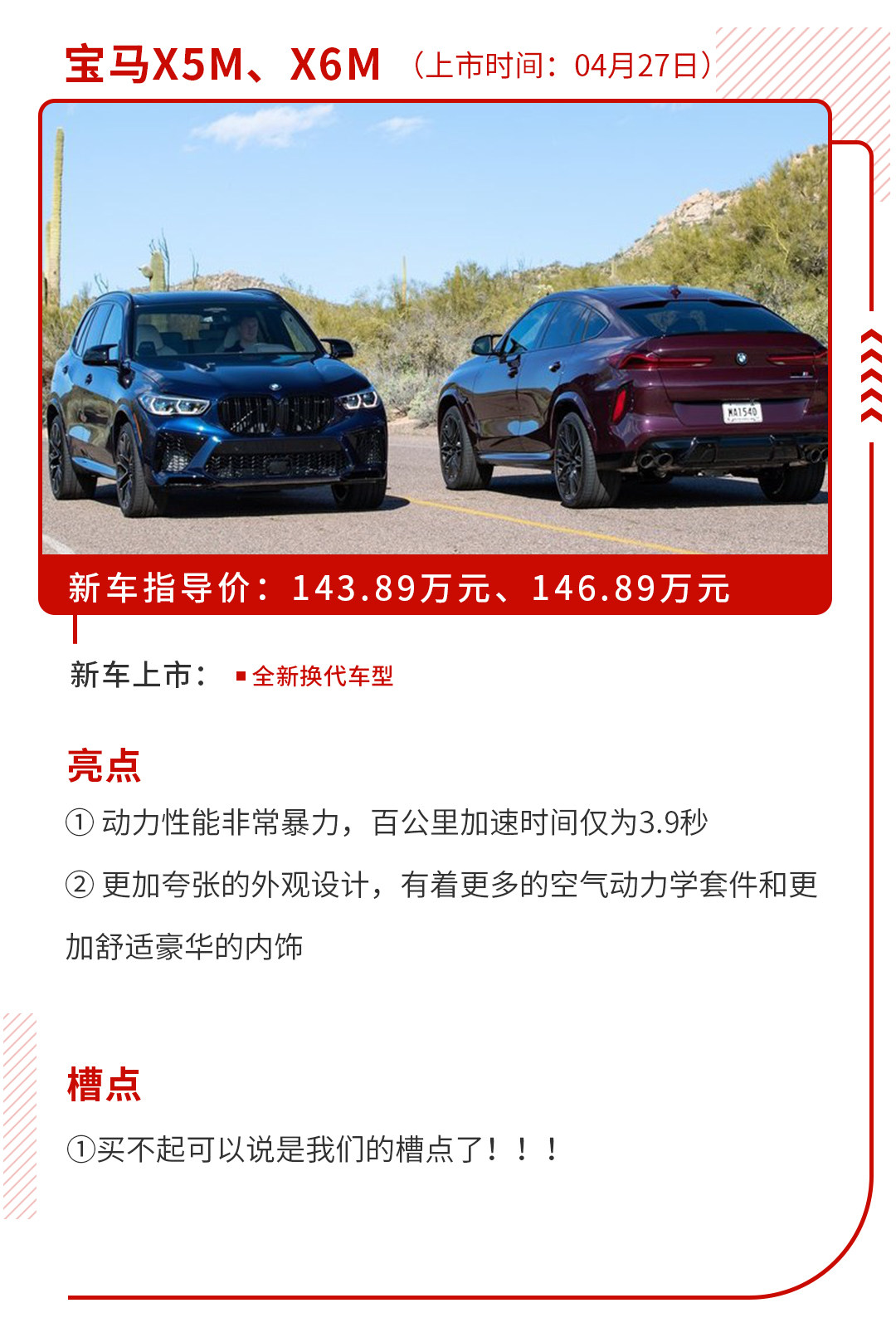 X5M和X6M两款新车均搭载宝马目前量产发动机性能最强的4.4T双涡轮增压V8发动机,相比之下,较之上一代发动机动力性能有较大提升。在账面上,该款发动机坐拥608马力的最大功率以及750牛·米的峰值扭矩,而百公里加速时间仅为3.9秒,而8速M Steptronic变速箱拥有3种换挡模式。两款新车还有M专属底盘悬架、M xDrive智能全驱系统、主动式M差速锁等核心“武器”,关于驾驶乐趣,这点还是留给消费者去想象吧。