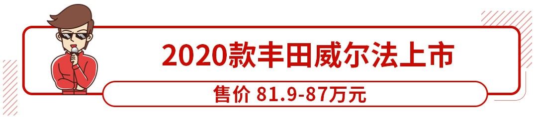 4月30日,2020款丰田威尔法正式上市,新车售价区间为81.9-87万元,共计两款车型,分别为2.5L VH豪华版和尊贵版。本次作为年度小改款,新款威尔法的变化不大,主要对配置进行调整。新车将全系配备后排DVD娱乐影音系统(带13.3英寸液晶显示屏)、FDM流媒体后视镜(9.6英寸)、多媒体显示以及AVN导航系统(10.5英寸)以及RCTAB倒车侧后方盲点警示系统等,配置相比2019款有所提升。动力方面将继续搭载2.5L发动机的混合动力系统,最大功率211马力,最大扭矩409牛·米,传统匹配E-CVT变速箱和E-Four电控四驱。