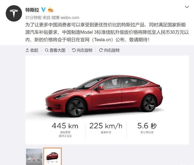 日前,特斯拉在官方微博表示,为了让更多消费者享受更有性价比的产品,同时满足国家新能源汽车补贴要求,国产Model 3标准续航升级版将降低至30万人民币以内(当前官方指导价为32.38万元,补贴后售价为30.355万元),而新的价格将于明天在官网公布。而根据2020年国家新能源政策要求,补贴前售价在30万以上的产品将在7月22日后不再享受补贴。因此在特斯拉发布车型降价消息后,很多人都认为特斯拉又有了合法又合理的“降价理由”,而本次降价的车型属于国产Model 3最入门的版本,当门槛进一步下降后或许会对25-35万元之间的新能源市场带来一定影响。