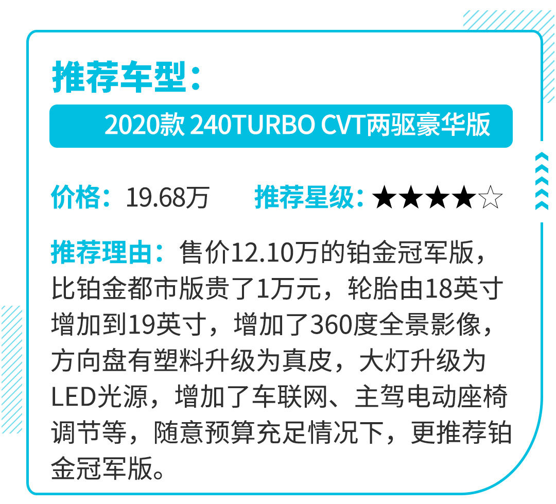 在这些车型中,买买君推荐售价12.10万的2020款 1.5GDIT 自动铂金冠军版。
